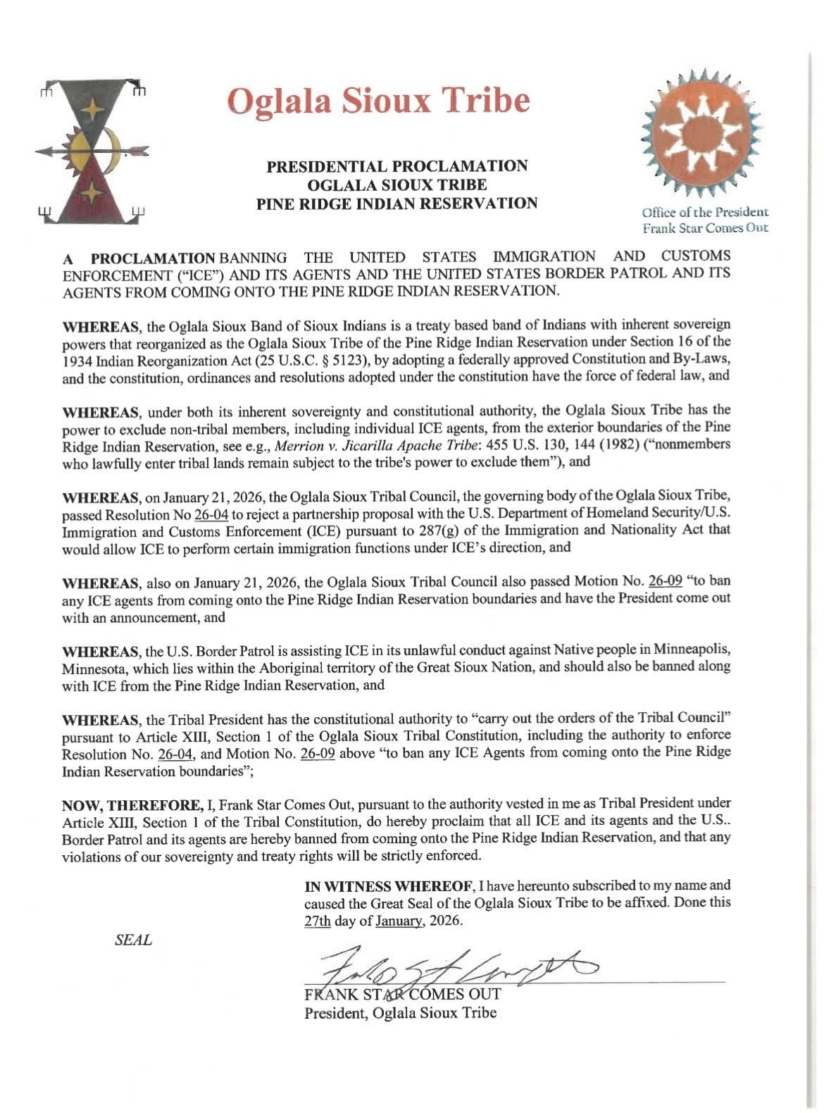Oglala Sioux Tribal President Frank Star Comes Out has issued a proclamation banning U.S. Immigration and Customs Enforcement (ICE) and associated border patrol agents from entering the Pine Ridge Indian Reservation in South Dakota.