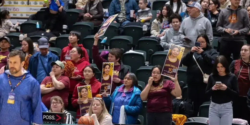 Members of the crowd at the 2026 ASAA 1A/2A Basketball State Championships in March hold signs with a photo of Kelly Hunt printed on them. (Photo: Waatsasdiyei Apayakuk Yates)