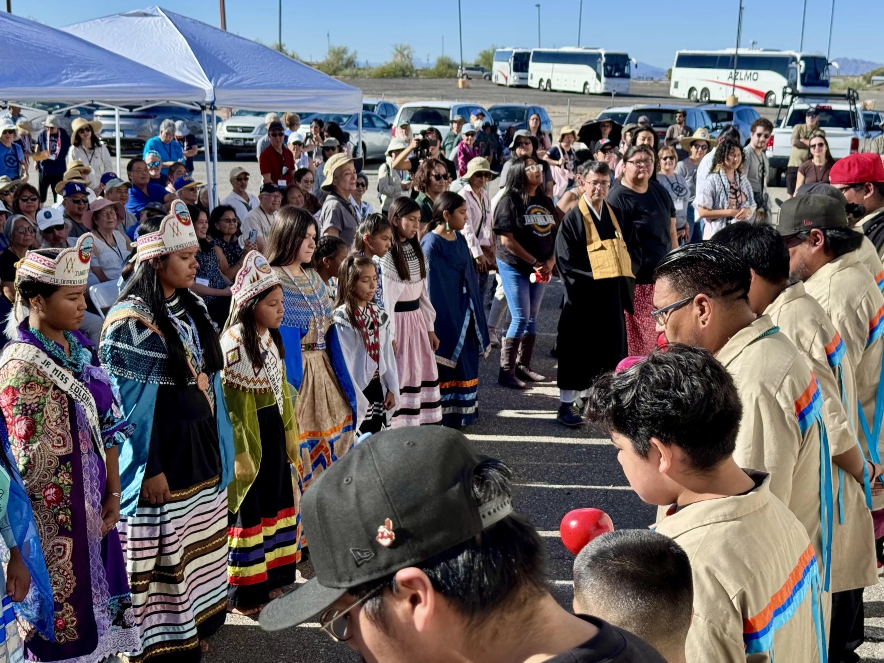Youth groups from the Colorado River Indian Tribes honor Poston pilgrimage guests with bird dances and songs on October 25, 2025. (Photo: Gabriel Pietrorazio / KJZZ)