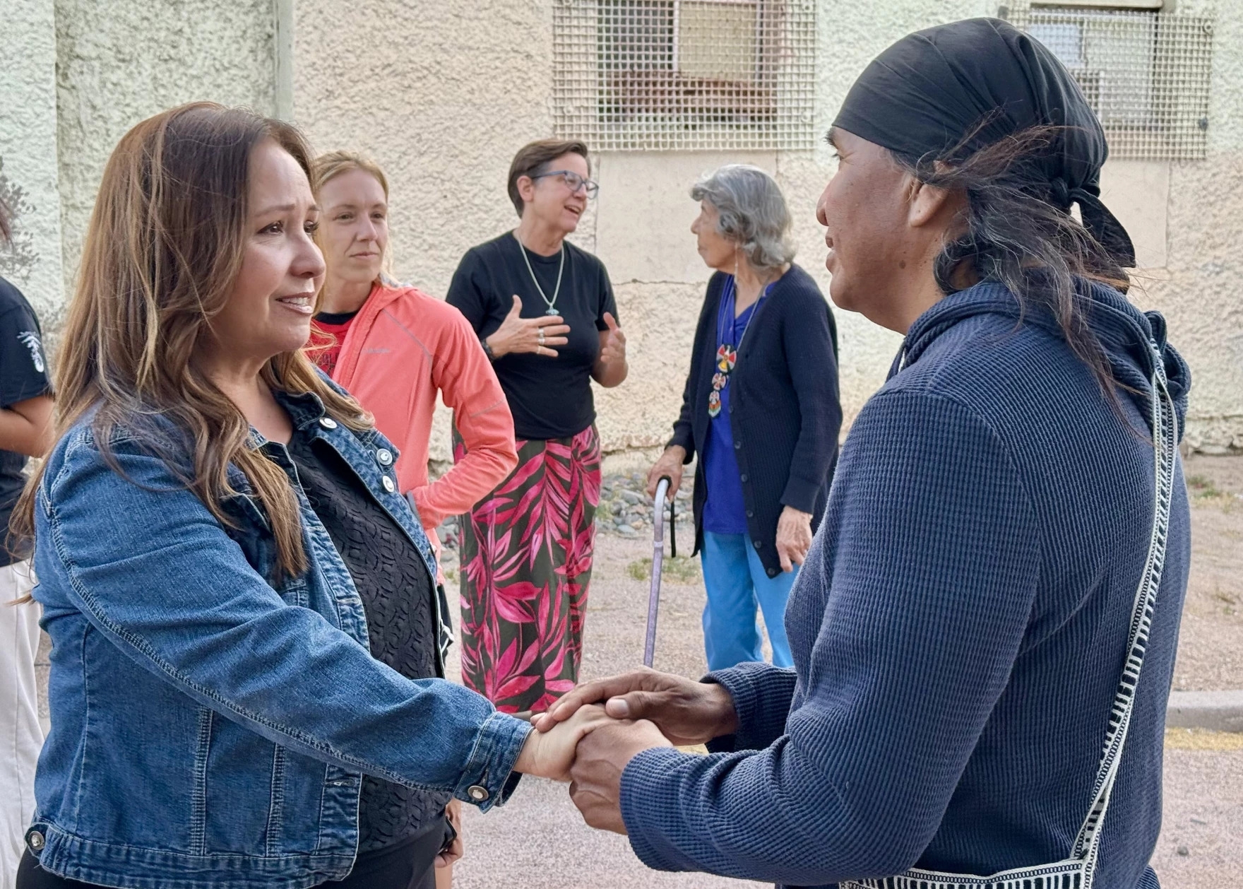 U.S. Rep. Adelita Grijalva (D-AZ), left, meets with Apache Stronghold founder Wendsler Nosie Sr. in Guadalupe on May 5, 2025. (Photo: Gabriel Pietrorazio / KJZZ)