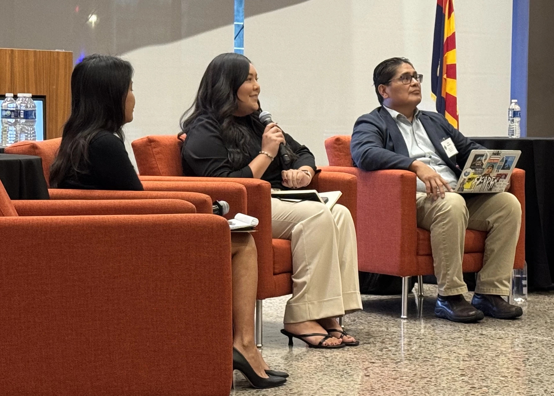 Jenner & Block special counsel Krystalyn Kinsel, left; Cora Tso, senior research fellow at ASU’s Kyl Center for Water Policy; and Chris Deschene, executive director of National Inter-Tribal Energy Council, discuss AI’s impacts on natural resources during “Wiring the Rez.” (Photo: Gabriel Pietrorazio / KJZZ)