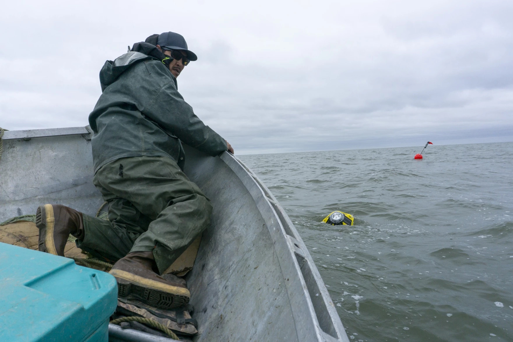 Quinhagak resident Patrick Jones deploys a buoy in the Yukon-Kuskokwim Delta region in early summer 2025. (Photo: Sean Gleason)