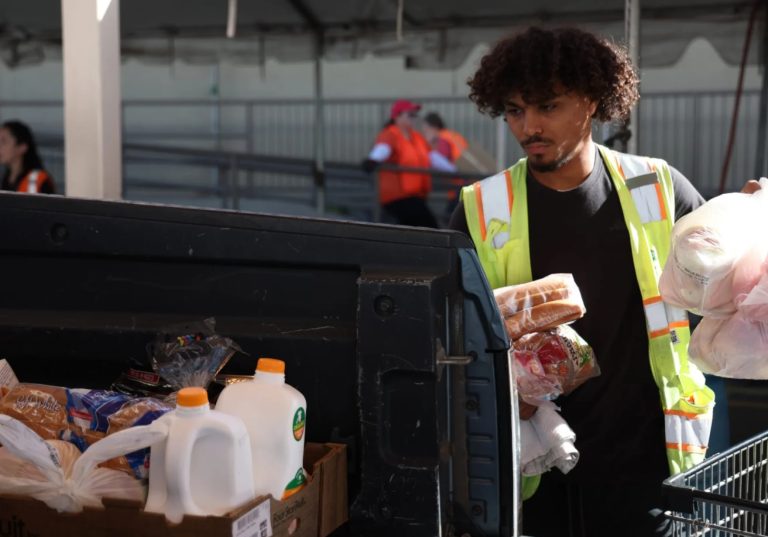 Photo: Volunteer Tristan Pall packs food boxes in a truck bed at St. Mary’s Food Bank in Phoenix, Ariz. on October 30, 2025. (Shi Bradley / Cronkite News)
