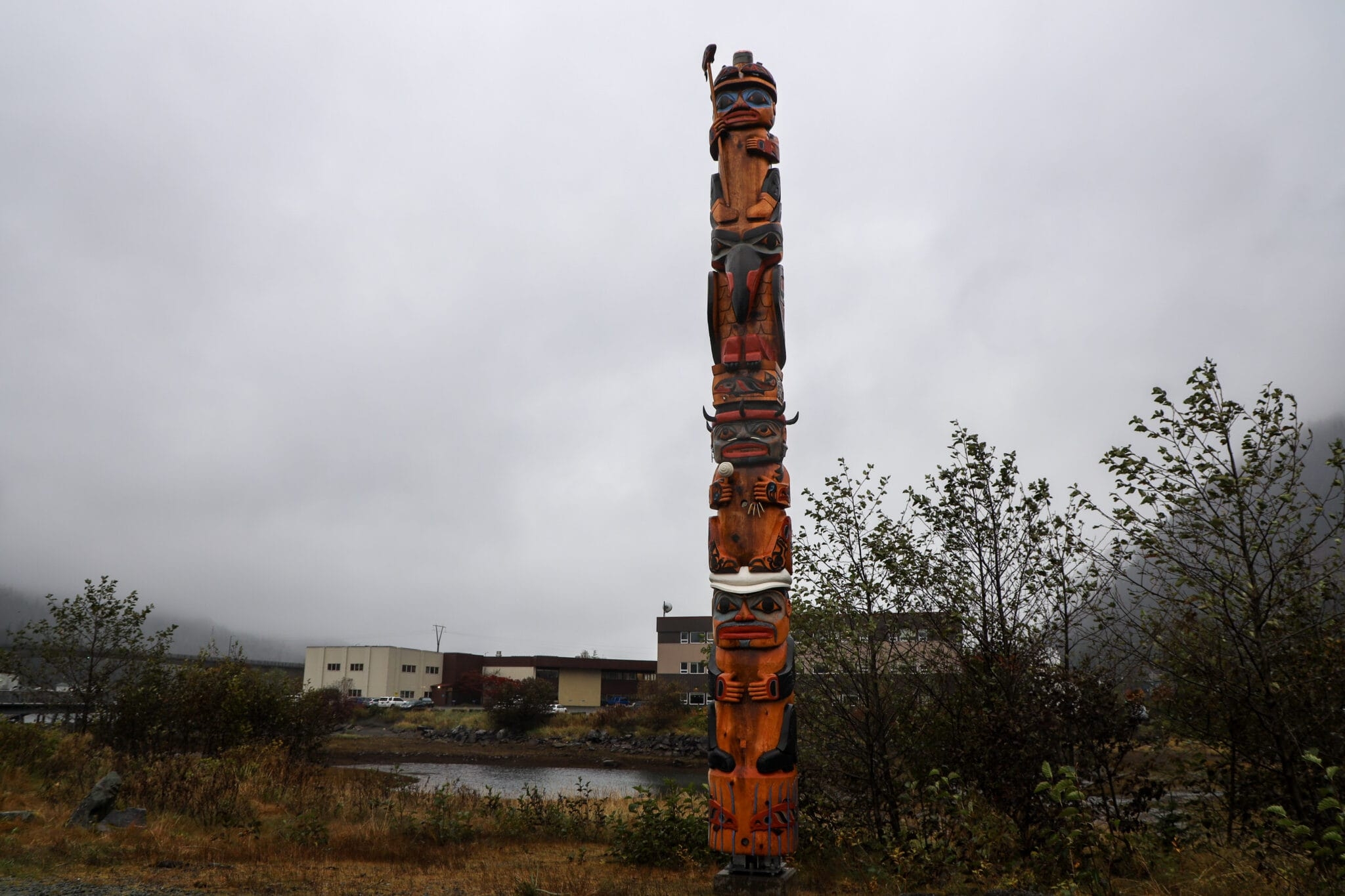 A totem pole representing the Sukteeneidí clan on October 14, 2025. (Photo: Clarise Larson / KTOO)