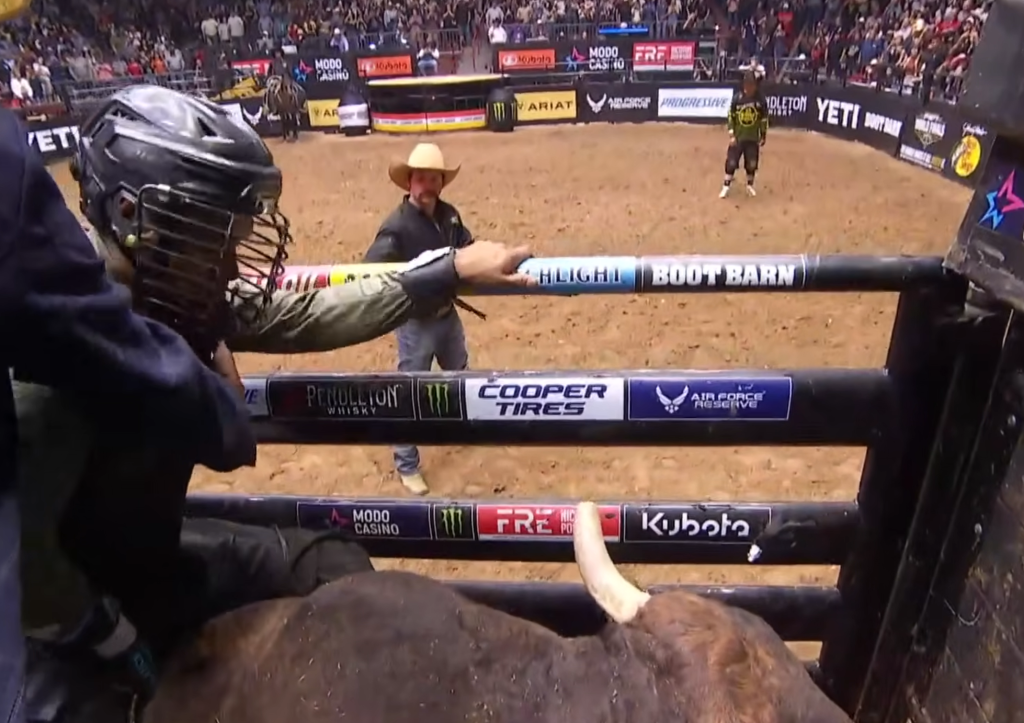 For the first time, Keyshawn Whitehorse from Kraken Springs, Utah won the Ty Murray Invitational after hanging onto a bucking bull named “Lights Out”.