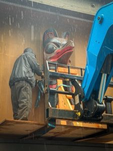 The Totem Heritage Center’s Raven house post is reinstalled last week. (Photo: Deborah Mercy / Ketchikan Museums Department)