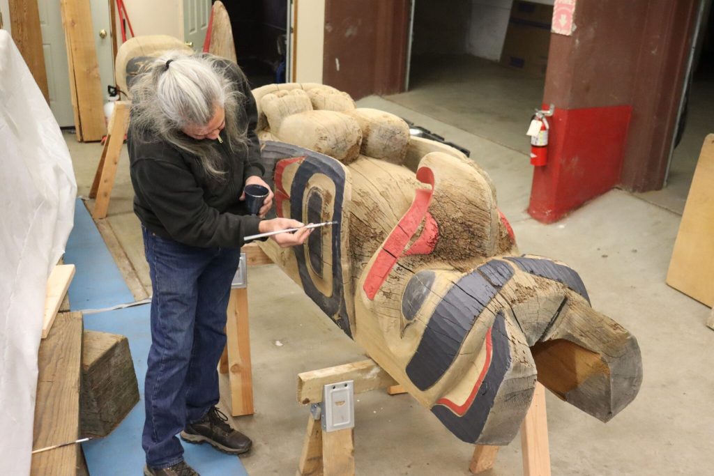 Photo: Tlingit master carver Tommy Joseph paints the Totem Heritage Center’s Eagle house post. (Hunter Morrison / KRBD)