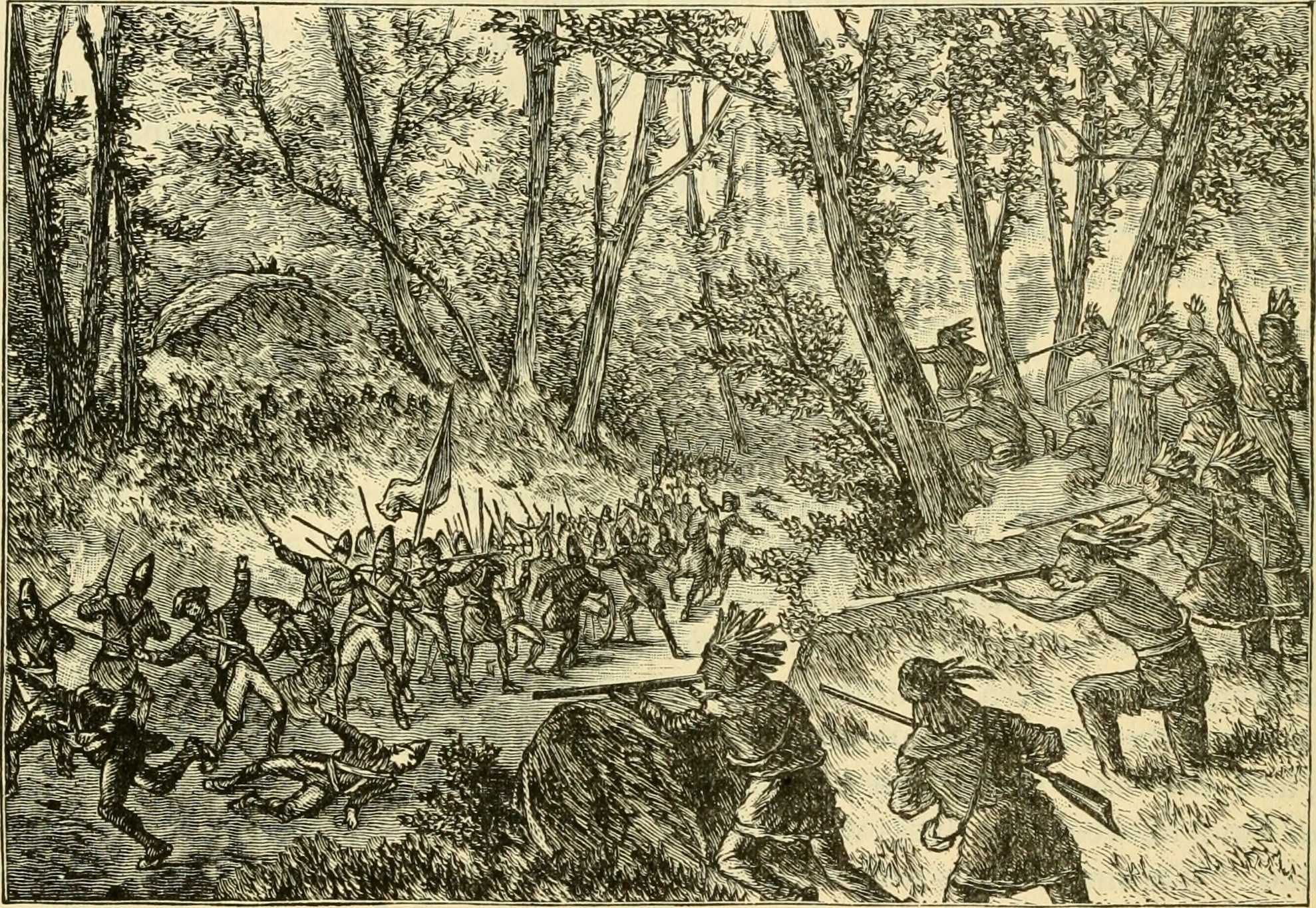 British forces under fire from the French and Indian forces at Monongahela, when the Braddock expedition failed to take Fort Duquesne.