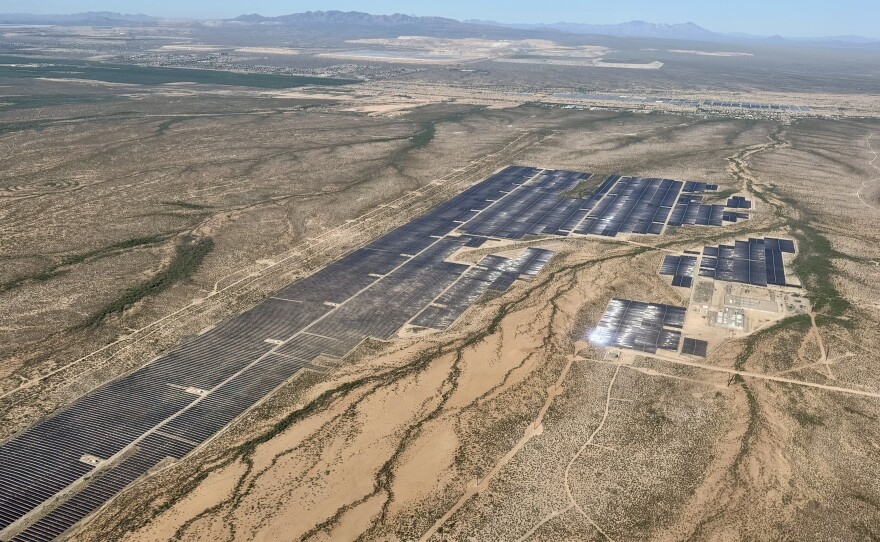 An aerial view of solar panels near Tucson during an EcoFlight tour in April 2026. (Photo: Gabriel Pietrorazio / KJZZ)