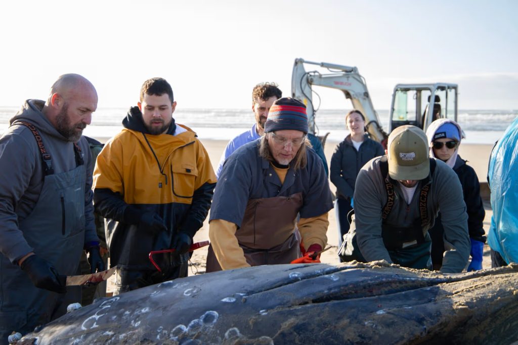 CTSI tribal members Todd Logan, Joshua Rilatos, and Dylan Gorman work with anatomic pathologist Kurt Williams of the OSU necropsy team to remove blubber, bones, and baleen for cultural use and tissue samples for diagnostic testing on Tuesday, November 18, 2025. (Photo: Jens Odegaard / Oregon State University)