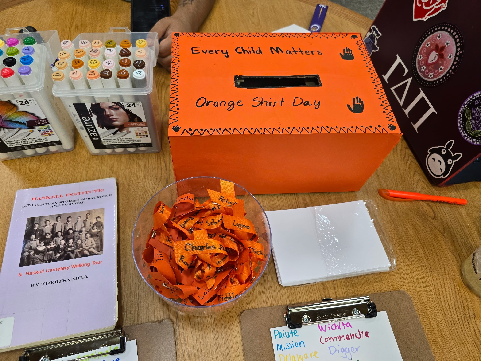 “We created pins with the names of children that were discovered at Haskell Indian Nations University. We put out their tribes and a website link so that people can find if they have a relative here or if they want to know more information about some of the children here like the ages they passed or time here at Haskell. We’re also leaving notes in case people have anything they want to say to the children.”